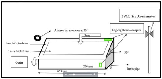Researchers are more interested to develop ways for increasing the productivity of a solar still by increasing the efficiency of the processes involved []. The produced water in a solar still is one of the cleanest forms of water, but there might be system and surrounding infused quality issues, which is left out of the scope of this study. A solar still’s efficiency is greatly affected by climatic factors such as wind velocity and geographic location with respect to latitude [,]. Variables such as the brine depth, geometric structure of the still with modifications such as the use of condensers, larger condenser areas, absorbent materials, and fins give a boost to distillate yield in a solar still []. The major drawback of a solar still is its low water yield since solar energy supply is intermittent. Conventional yields are 3–7 L/day for 1 m2 still area with mean global radiation of 4–8 kWh/m2 day [,,].