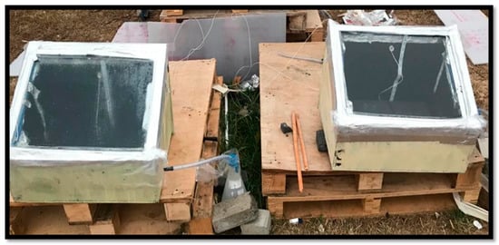 The solar still experimental setup is illustrated in Figure 1. The setup was made in an open field with the glass surface facing northwards to ensure reception of solar irradiance throughout the day. Data were collected over 55 days in the summer season (14 December 2019 to 6 February 2020). Both the solar stills were elevated on two 1165 mm × 1165 mm × 144 mm wooden platforms (Figure 2) to accommodate the brine drain and maintain stability of the structure. This was intended to reduce staining of the glass cover due to splattering mud from the ground during rain. This also gave a baseline for easy viewing of both the stills and access to monitoring and collecting data