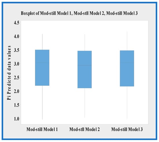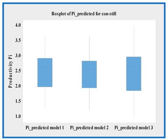 Figure 3 presents a boxplot of the productivity values obtained by predictive Models 1, 2, and 3 for the Con-Still. The first quartiles for all the three models are 1.84, 1.93, and 1.95 for Models 3, 2, and 1, respectively. The width of the box for Model 2 is smallest as compared to those of Model 1 and Model 3, which indicates the smallest variability in prediction by Model 2. The overall variability for Model 3 is the highest among the three models, which could be attributed to the highest number of predictors in Model 3.