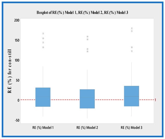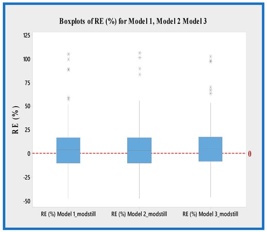 Figure 7 presents boxplot of RE (%) for Models 1, 2, and 3 of the mod-still. All three models have their median value remarkably close to 0-0 reference line. Model 2 has the least number of outliers as compared to the other two models. The widths of the boxes are remarkably similar for the three models. Overall, the three models show similar level of accuracy in prediction for majority of cases.
