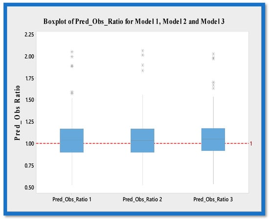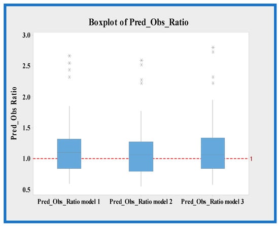 Boxplot of Pred_Obs Ratio of Models 1, 2, and 3 (mod-still). (* represents outlier data).