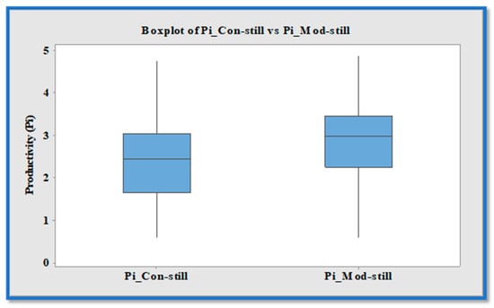 Figure 9 shows a boxplot comparing the productivity of the con-still and mod-still. It is evident that the modified version of the still with incorporated pavers in the basin had higher productivity values. The 25% quartile of the mod-still is almost equal to the median value of the con-still. Both have equal minimum and maximum values, with the mod-still being a bit higher for each. This can be attributed to the amount of extra heating made available during diurnal hours by the pavers due to their characteristic thermal conductivity.