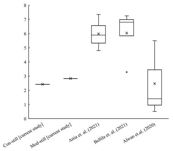 Figure 10 presents a boxplot comparing the productivity of the con-still and mod-still. It is evident that the modified version of the still with incorporated pavers in the basin had higher productivity values. The 25% quartile of the mod-still is almost equal to the median value of the con-still. Both have equal minimum and maximum values, with the mod-still being a bit higher for each. This can be attributed to the amount of extra heating made available during diurnal hours by the pavers due to their characteristic thermal conductivity.