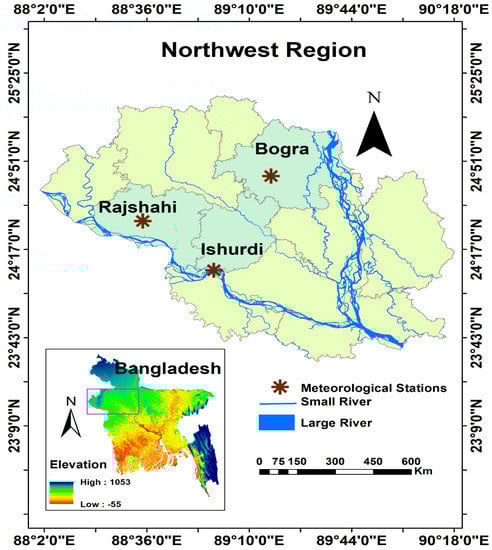 The study area is situated in the northwest region of Bangladesh as shown in Figure 1 (24.08° N to 25.13° N latitude and from 88.01° to 89.10° E longitude). The study region is a part of the Barind Tract, distributed mainly in the greater districts of Rajshahi, Bogra, and Pabna, which have a gross area of 7727 km2 []. Bangladesh has a subtropical monsoon climate with large spatial and temporal variability. It has four different seasons (e.g., pre-monsoon, monsoon, post-monsoon, and winter). In 85% of the country, annual rainfall occurs in the monsoon period. Less than 6% of rainfall occurs in the winter period. In the northwest, the annual mean total rainfall is 1329 mm []. In the winter season, the mean temperature varies between 17 and 20.6 °C while in the post-monsoon, it ranges from 26.9 to 31.1 °C. The Bangladesh Meteorological Department (BMD) reported that the temperature in pre-monsoon increases to 45 °C and the temperature in winter falls at 5 °C in the northwest part of the study area []. The northwest region experiences extreme events such as drought more frequently than the remaining parts of the country.
