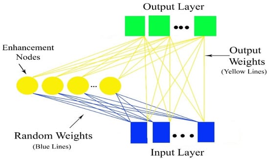 The Random Vector Functional Link (RVFL) networks of the input pattern accomplishes a non-linear transformation before feeding into the network’s input layer, which generates an enhanced pattern []. The RVFL is a type of Single Layer Feedforward Neural Network (SLFNN), containing a connection between the input and output layers, as shown in Figure 2. This link prevents the over-fitting problem, which is common in traditional SLFNN. The primary role of a functional link is to try to extend a feature space, which can induce an anticipated function. The RVFL obtains the Ns sample data (X), characterized as a pair (xi, yi), where yi is the goal variable. The input data are processed through the middle (hidden) nodes afterward. These middle nodes are called nodes of enhancement. Each middle node’s output is computed as below: