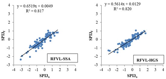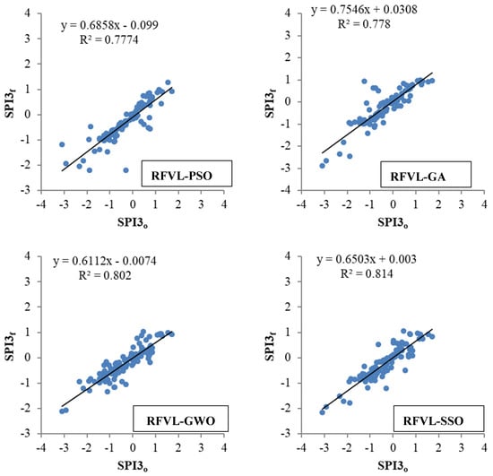 For example, the RFVL-based models are compared on scatter diagrams in Figure 3 in forecasting drought based on SPI3 and using the optimal inputs and the periodicity component (MN) for station 2. Among the metaheuristic algorithms, HGS seemed to have the least scattered forecasts in the test stage. At the same time, the PSO provided more scattered SPI3 values than the other algorithms. Similarly, the hybrid RFVL-based models are compared in Figures S1–S3 in forecasting SPI6, SPI9, and SPI12, respectively. As evident from the graphs, the RFVL–HGS provided the best forecasts with the lowest scattering. The RFVL–SSA and RFVL–SSO followed, and the RFVL-PSO had the worst accuracy in forecasting drought based on the SPI6, SPI9, and SPI12.