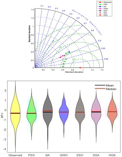 Figure 4 compares the drought forecasting accuracies of the RFVL-based models based on the SPI3 index using the Taylor and violin charts. Similarly, the Taylor and violin charts of the hybrid RFVL-based models are compared in Figures S4–S6 in forecasting SPI6, SPI9, and SPI12, respectively. It can be seen from the Taylor charts that HGS had a closer standard deviation to the observed one compared to other algorithms, and it had the lowest RMSE and the highest correlation. The violin charts show that the drought forecasts of the HGS-based RFVL provided a closer distribution to the observed one than other alternatives. The assessment criteria and visual inspections tell us that the metaheuristic algorithms considerably improved the accuracy of the RFVL method in forecasting drought based on SPI indices. Among the algorithms, the HGS had the best efficiency. The main advantage of the population-based HGS method is its stochastic switching elements, which enriches its exploratory and exploitative behavior. It has a high efficiency in handling multi-modality and local optima problems because it has an adaptive and time-varying mechanism [].