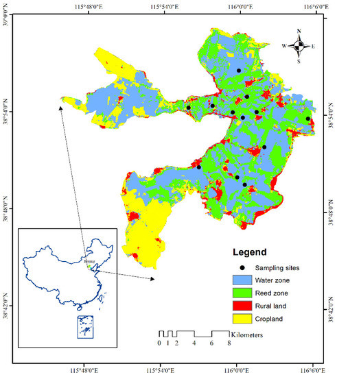 Study area and map of sampling site locations in Baiyangdian Lake (this figure was produced from a Landsat 8 image at the high-water level in 2015).