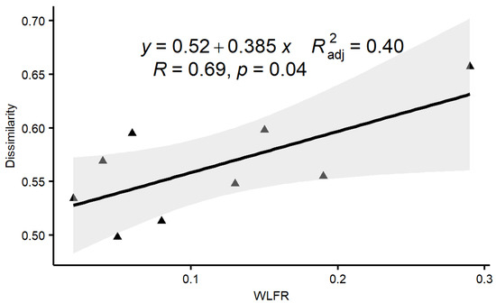 Correlation between the dissimilarity of macroinvertebrate assemblages in two consecutive sampling events and the monthly water level fluctuation range (WLFR) (the solid line represents the estimated regression line for the dataset with outlier omitted).