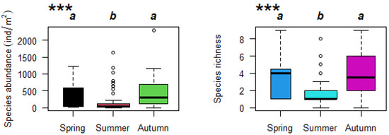 Seasonal pattern of macroinvertebrate species abundance and richness in Baiyangdian Lake (the same letters indicate nonsignificant differences; *** represents significant differences existing among seasons (p < 0.001)).