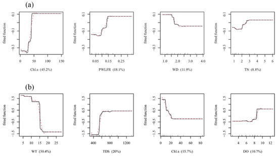 Microhabitat factors influencing macroinvertebrate species abundance were different in summer from those in spring and autumn (Figure 4). The BRT model indicated that Chl a (45.2%) and PWLFR (18.1%) had the strongest influence on the species abundance of macroinvertebrates in summer (Figure 4a). Water depth and total nitrogen also had an obvious impact on species abundance in summer. The results of the BRT model indicated that high species abundance was most likely found in areas where the concentration of chlorophyll a was high, the range of water level fluctuations was large, and the water depth was relatively shallow in Baiyangdian Lake (Figure 4a). In summer, the impact of PWLFR on macroinvertebrate species abundance increased with an increase in PWLFR (Figure 4a). When PWLFR reached 20%, the increasing trend of this influence stopped and remained relatively stable. In contrast to the summer species abundance, in spring and autumn, the four dominant factors affecting the species abundance of macroinvertebrates were WT (30.4%), TDS (20.0%), Chl a (15.7%), and DO (10.7%) (Figure 4b). However, PWLFR did not show a powerful effect on species abundance in spring and autumn. The partial dependence results from the spring and autumn fitted model indicated that high species abundance occurred in the area with low WT and Chl a and high TDS and DO in the shallow lake. Species abundance declined with the increase in WT in spring and autumn.