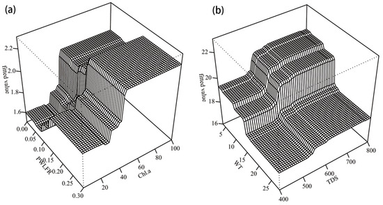 The results showed interactions between the habitat factors in each season (Figure 5). The strongest interaction effects involved the PWLFR and Chl a in summer, and their interaction can increase macroinvertebrate species abundance. When PWLFR was less than 15%, as PWLFR increased, Chl a had a greater impact on species abundance (Figure 5a). When PWLFR exceeded 15%, the interaction between these two factors was not obvious. Compared with summer, the strongest interaction effects in spring and autumn were WT and TDS (Figure 5b). The species abundance in spring and autumn decreased rapidly with increasing WT. When considering TDS, the higher TDS is, the greater the decrease in species abundance with the increase in WT will be.