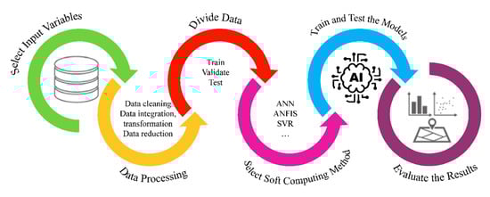 As shown in Figure 5, the first step of modeling via soft computing methods is the dominant input selection that can remarkably affect the modeling efficiency. The following steps are data processing, data dividing, selecting the soft computing method, and training and testing the models. The training process is also an important phase that is influenced by different issues. The final step is visualizing and evaluating the outputs. There are various soft computing tools in this paper, including ANNs, ANFIS, SVM, GP, DL; some hybrid methods are summarized for seepage modeling.