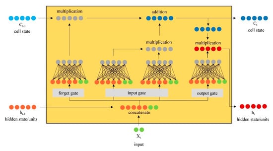 Two well-known and mainly employed DL methods are long short-term memory (LSTM) and convolutional neural networks (CNNs), which are employed for sequence processing like time series and image processing tasks, respectively. LSTM, which is a type of RRN, was developed by Hochreiter and Schmidhuber [84]. It comprises memory blocks linked by layers instead of neurons, as seen in ANNs. The LSTM unit has three components: input, forget, and output gates. It decides what information and new inputs are transferred to the next unit by the input gate, while the forget gate determines which information should be omitted. The output gate determines which results are to be produced [85]. The advantage of LSTM is that it takes a dynamic window size to capture the autoregressive component of time series instead of a fixed window size. Nevertheless, at the same time, with the lengthening of this window, the complexity of the model is increased, and there may be no significant improvement in its performance [86]. Figure 6 depicts the schematic of the internal structure of the LSTM unit with input, forget, and output gates; in Figure 6, as an example, the LSTM block has five hidden units and an input dimension of 2. For more details about LSTM, refer to [86].