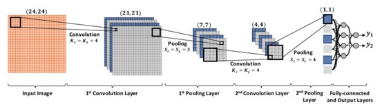CNNs are neural networks, which are mainly employed to recognize and classify images. However, they can be used to process time series; for instance, they are employed for natural language processing. In general, the structure of a CNN consists of three types of layers. The first types are convolutional layers that include filters and feature maps. The filter is slid on the previous layer. The input of a filter has a fixed size named receptive field, and the results are saved in the feature map. The second types are pooling layers, which usually come after convolutional layers. Pooling layers act as a down sampling of the preceding layers feature map; as a result, one can consolidate the information in case a receptive field is switched over the feature map. These fields employ simple operations such as full selection or averaging. Like the LSTM models, in deeper models, one can stack numerous pooling and convolutional layers on top of one another in a variable order. The third types are dense layers, which are fully connected layers with more output nodes [87]. The schematic of a CNN is shown in Figure 7; it depicts an example of a CNN model with inputs of 24 × 24-pixel grayscale images classified into two classes. This model is comprised of two convolutions and two pooling layers that are finally linked to fully connected and output layers. For more details about CNN, refer to [58,86]. Autoencoders, restricted Boltzmann machines (RBMs), deep belief network (DBN), and generative adversarial networks (GANs) are other types of DL models that are less common in hydrological modeling.
