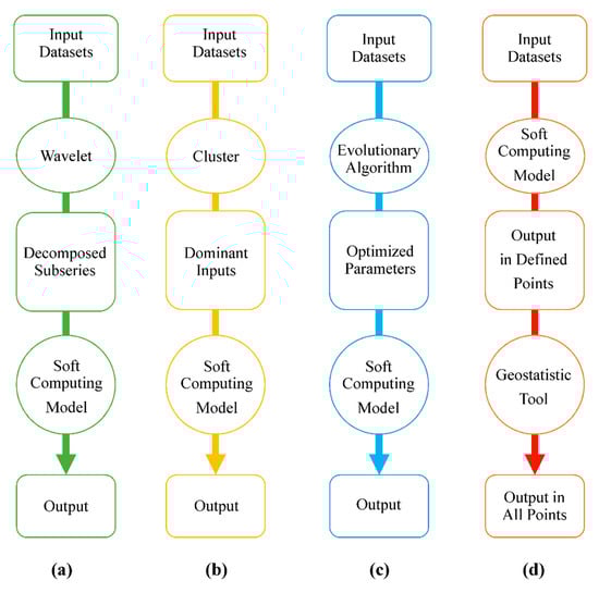 Schematic of common hybrid soft computing methods for seepage modeling. (a) Wavelet-soft computing methods; (b) cluster-based soft computing methods; (c) evolutionary-soft computing methods; (d) soft computing geostatistic-based methods.
