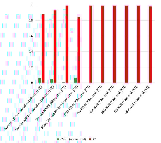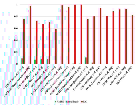 where N refers to number of data, Sobsi shows the observed data, Ŝobsi refers to the mean observed data, and Scomi shows the output (estimated) data. DC ranges from −∞ to 1, with a perfect score of 1; RMSE ranges from 0 to +∞, with a perfect value of 0. It was proved by Legates and McCabe [102] that performance of hydrological and environmental models can be determined by DC and at least one absolute error measure (e.g., RMSE or MAE) criteria. It is worth mentioning that the value of RMSE can be different across various studies and depending on range and dimension of output variables. Thus, comparing the performance of models in different studies would not be fair, unless normalized RMSE is reported. Therefore, to present a fair evaluation, reported DC by papers, which does not have dimension, normalized RMSE (where available) were employed in this review. Additionally, for the multiple DCs, the average was calculated.