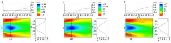 The non-dimensional time-averaged () velocity represents the trend of the shear layer and trailing region with Ar or Re. Figure 5 illustrates the non-dimensional time-averaged flow speed contour, y/D = 0 velocity profile, and spanwise velocity profile of the low-speed zone’s center under varying operating circumstances. Overall, the flow velocity was distributed symmetrically along the middle axis. The flow breaks from the plate’s leading edge, most of the flow spreads to the sides, and some of the flows interfere with each other in the trailing region, generating a low-velocity zone. When the Ar was the same, the breadth of the low-velocity zone steadily decreased as the Re increased. Furthermore, the middle portion of the low-velocity zone gradually closed to the plate, suggesting that the inertia of the water flow was increased, which corresponds to an increase in the Re. When the Re was constant, the low-velocity zone retained the same fluctuation features as the Ar increased, indicating that the extended plate slowed the formation of the shear layer.