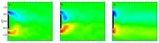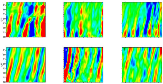 The horizontal coordinate in Figure 7 is the non-dimensional delay time , and the vertical coordinate is the non-dimensional position x/D. As a result, the physical means of each point in the figure were the correlation coefficient between the streamwise fluctuation velocity u′ of any streamwise position and the streamwise fluctuation velocity u′0 of the reference point at any time, respectively.