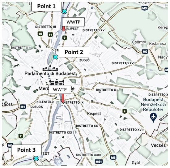 The different inputs (e.g., the use among the human population) of the chemicals and the distance from their source determined the different concentrations found in the Danube at each sampling point. Although they are not prescribed in Hungary, fenoprofen, estrone and gemfibrozil were found (at quite low concentrations) in this stretch of the river. This means that the Danube in Budapest is also contaminated by pharmaceuticals used in southern Germany and northeast Austria. In any case, at Point 2 inside the city and immediately downstream from a WWTP, the concentrations of antibiotics and diclofenac were the highest. Interestingly, even though the WWTP located immediately before Point 2 (processing 180,000–200,000 m3 of sewage per day) is smaller than that before Point 3 (processing 350,000–500,000 m3 of sewage per day), the location of Point 2 made it the highest impacted by the WWTP contamination, (Figure 1). Moreover, because the river water before reaching Point 3 shapes two branches, only one will have a contaminant load.