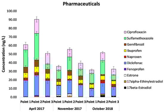 Figure 2 shows the average pharmaceutical concentrations at Point 1, Point 2 and Point 3 over April 2017, November 2017 and October 2018 samplings. Pharmaceuticals were found in higher amounts (p < 0.05) in April than November and October samplings. Antibiotics were among the most abundant pharmaceuticals and SMX was in higher concentrations (5–35 ng/L) than CIP (3–16 ng/L). The highest SMX amounts were found at Point 2 (inside Budapest), (20.9 ± 4.9 ng/L).