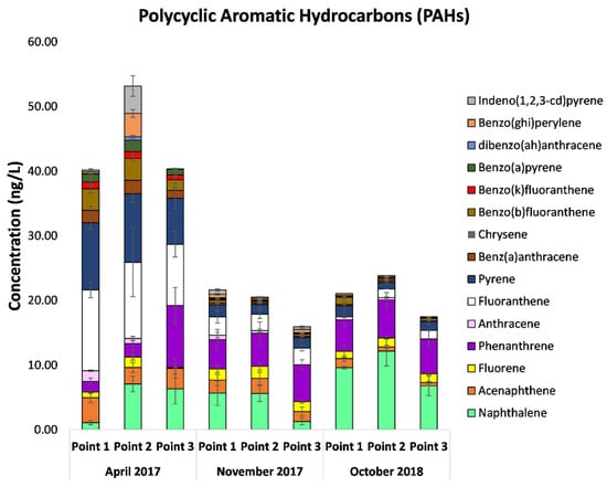 Figure 3 shows the average PAH concentrations at Point 1, Point 2 and Point 3 detected during the April 2017, November 2017 and October 2018 samplings. PAHs were in significantly higher amounts in the April sampling than the other ones (November and October). A peak (12.2 ± 2.3 ng/L) in naphthalene concentration was found in the October sampling.