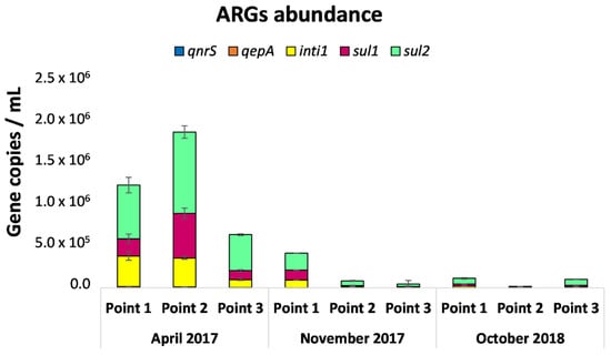 Figure 4 shows the average ARG concentrations at Point 1, Point 2 and Point 3 in the April 2017, November 2017 and October 2018 samplings. The most abundant ARGs were detected in April 2017 and the highest values were found at Point 2 (Figure 4). Interestingly, in all samplings SMX-genes (sul1, sul2) were more abundant than CIP-genes (qnrS, qepA), in line with the higher SMX concentrations.
