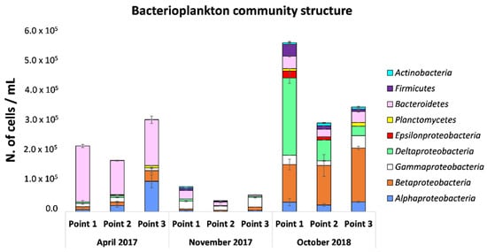 The structure of the bacterioplankton community at Point 1, Point 2 and Point 3 in April 2017, November 2017 and October 2018 samplings are reported in Figure 5. The Bacteroidetes and Alphaproteobacteria groups were dominant in April 2017; Gammaproteobacteria and Actinobacteria increased significantly in November 2017. Finally, a further shift in the bacterial community was observed in October 2018, with an increase in Betaproteobacteria and Deltaproteobacteria.