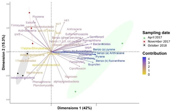 Principal component analysis (PCA) performed on overall data regarding pharmaceuticals, PAHs, ARGs and the main bacterioplankton groups obtained from the different sampling times and points. Green dots represent Point 1, Point 2 and Point 3 in the April 2017 sampling; red dots represent Point 1, Point 2 and Point 3 in the November 2017 sampling; and black dots represent Point 1, Point 2 and Point 3 in the October 2018 sampling. The gradient contribution represents the contribution of the variables to each dimension (from yellow: weak to blue: strong).