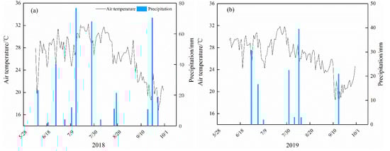 Air temperature and rainfall during the maize growing season in (a) 2018 and (b) 2019.