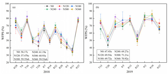 Changes in soil water filled pore space (WFPS) in different treatments in (a) 2018 and (b) 2019. Values (%) in the textbox indicate results of one−way ANOVA, (n = 3). Different small letters mean the significant differences among various nitrogen treatments (p < 0.05). The same as below.