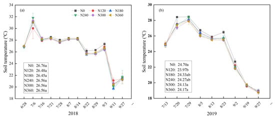 Changes in soil temperature in different treatments in (a) 2018 and (b) 2019.