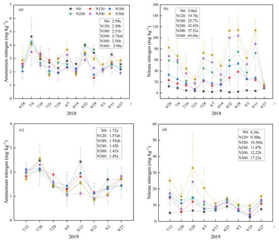 in each treatment decreased by 36.1% and 63.9%, respectively, compared with that of 2018. The soil ammonium nitrogen content of each treatment was not significantly affected (p > 0.05) by nitrogen fertilizer treatment in 2019, but there were differences in the soil ammonium nitrogen content of each treatment in 2018 (Figure 4). The average −N content of N360 and N300 in 2018 and N360 in 2019 was significantly higher (p < 0.05) than that of other treatments (Figure 4). From Table 2, there was no significant linear correlation between nitrogen application rate and soil ammonium nitrogen, but a significant positive correlation with soil −N. However, the R2 of the fitting equation was low, indicating that the relationship between nitrogen application rate and soil −N could have other functional relationships.