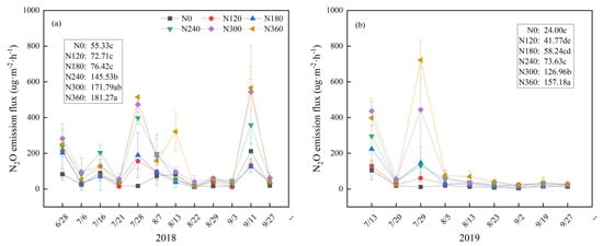 Dynamics of soil N2O emission flux in different treatments in (a) 2018 and (b) 2019. Values (μg m−2 h−1) in the textbox indicate results of one−way ANOVA.