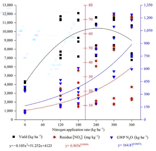 content would sharply increase. Using the same method, the linear equation system of N2O warming potential response to nitrogen application rate can be obtained: y = 0.6005x + 227.5, y = 3.3624x − 236.42. The inflection point (x = 167.97 kg·ha−1) of N2O warming potential in the maize field was obtained by solving this equation system. In order to ensure that the maize yield would not be greatly reduced, 95% Yieldmax was taken as the lower limit of the N application threshold. According to the function, nitrogen application rate, residual nitrogen concentration, and GWP N2O were calculated. The function image is shown in Figure 6, and the calculation results are shown in Table 4. While considering the yield, soil, and greenhouse gas emissions, when the nitrogen application rate was 173.94~178.34 kg·ha−1, the yield decreased by 4.39~5.00% compared with the maximum yield. Moreover, the residual concentration of −N in soil could be reduced by 27.1~28.7%, and GWP−N2O could be reduced by 26.7~28.2%. So this range of N application (173.94~178.34 kg·ha−1) could not significantly reduce maize yield while it could significantly reduce soil −N