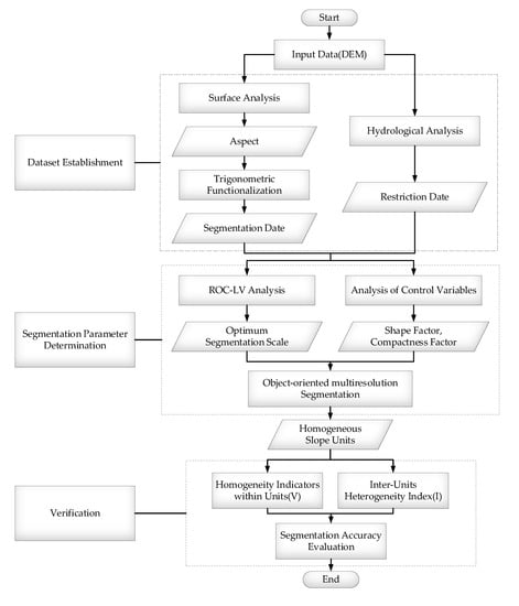 In this paper, we aim to propose an effective and accurate method of slope unit segmentation by integrating digital terrain into an image segmentation analysis framework. In view of the complexity of surface feature information in a high-resolution image, multiresolution segmentation is introduced to overcome the limitation of traditional methods as mentioned above. At the same time, considering the slope aspect, water system, catchment area, and other factors, the rule sets and automatic segmentation program for image segmentation are established to generate the appropriate slope unit. An evaluation function, which is defined by within-unit homogeneity and inter-unit heterogeneity, is proposed to verify the effectiveness of the proposed segmentation method. The framework of our proposed method is illustrated in Figure 1.