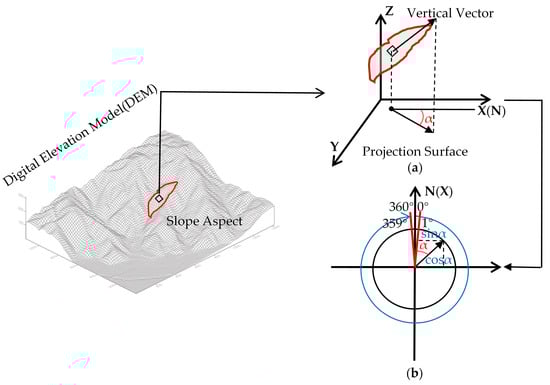 The slope aspect is calculated from the DEM data in the ArcGIS environment. The definition of the slope aspect is shown in Figure 2a, where slope aspect α is defined by the angle between the standard projection of the tangent plane of a point on the surface and the northward direction of the location. It is the maximum change direction describing the elevation change in DEM data. As shown in Figure 2b, the calculated slope aspect is the azimuth value ranging from 0 to 360 degrees, with the true north direction of 0 degrees. Instead of the slope aspect , herein we use the trigonometric function to convert slope aspect into and in X- and Y-direction. This treatment aims to avoid the illogical great aspect difference due to its cyclicity, i.e., the aspects of 1 and 359 degree both denote the directions close to the true north, but aspect difference is illogically as great as 358 degrees (as shown in Figure 2b). This problem can be well addressed using the above trigonometric function.