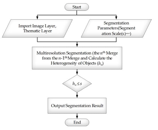 The multiresolution segmentation technique is based on the minimum criterion of heterogeneity [41]. After setting the appropriate segmentation parameters, starting from a random pixel in the target image, the heterogeneity after merging with adjacent pixels is calculated and compared with the segmentation scale. If the heterogeneity condition is satisfied, the cell can continue to be merged. Otherwise, the segmentation process ends. Accordingly, important segmentation parameters in the multiresolution segmentation algorithm include segmentation scale and heterogeneity factor.