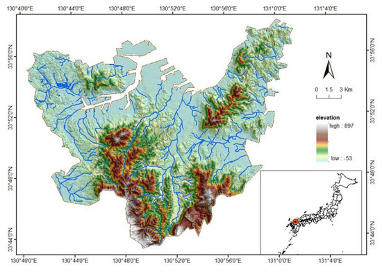 To verify the proposed method, Kitakyushu in Japan was selected as a study area. The area is located in Fukuoka County, the economic center of Kyushu (as shown in Figure 4). Most of the area is mountainous and has a humid climate, with an average rainfall of approximately 1265 mm per year. From 1989 to 2005, many landslides were recorded due to the impact of earthquakes and heavy rainfalls, causing tremendous fatalities and economic losses. In this paper, we apply the proposed method to generate slope units. The collected DEM data in this area have varying resolutions of 5 m, 10 m, 30 m, and 90 m. The 90 m and 30 m resolution DEM data are available in SRTM1 and SRTM3 data products. The 10 m resolution DEM data are collected from the Geological Information Authority of Japan (GSI), while the 5 m resolution data are from the altitude data set that was produced and made open to public by Japan Geographic Bureau using LIDAR [3]. In order to eliminate the errors caused by different coordinate systems, we transferred all first coordinate systems to GCS_WGS_1984 parallel systems. The results were then compared with the previous hydrological- and curvature-based method to evaluate the correctness and superiority of the proposed method in this paper.