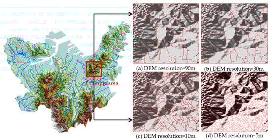 Figure 5 shows the results of the terrain subdivisions obtained using different modeling parameters. The maps in the right panel show the detailed slope units partitioning. In particular, Figure 5a–d show the overlaying slope units on the hill-shade maps of the example area, with different spatial resolution of DEM data. It is shown that along with the increasing DEM spatial resolution, the generated slope units increase in density and show a corresponding decrease in their average size.