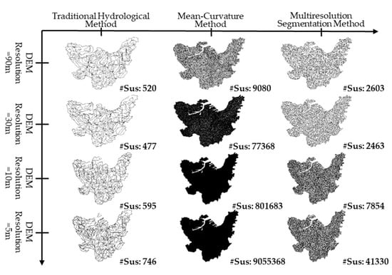 As shown in the right column of the maps in Figure 7, the proposed object-oriented multiresolution segmentation method divides the area into uniformly sized units, but the number of units is less than by the mean-curvature-based method. The increasing DEM spatial resolution also leads to an increasing number of slope units. However, compared to the mean-curvature method, the results are no more sensitive to the DEM resolution. In addition, the proposed multiresolution method generates the slope units well under four different DEM resolutions, without obvious parallel interferences that exist in the results by the traditional hydrological method, and the obtained slope units substantially coincide with the actual terrain.