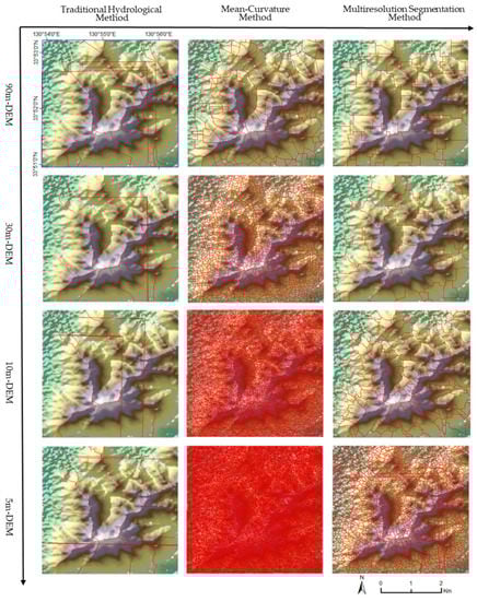 To verify the correctness and accuracy of the proposed method, the traditional hydrological-based method and the mean-curvature-based method are used as a comparison. In this section, we choose the best segmentation result of each method using the optimal parameters. The generated slope units using the three methods with different DEM data are shown in Figure 6 and Figure 7.