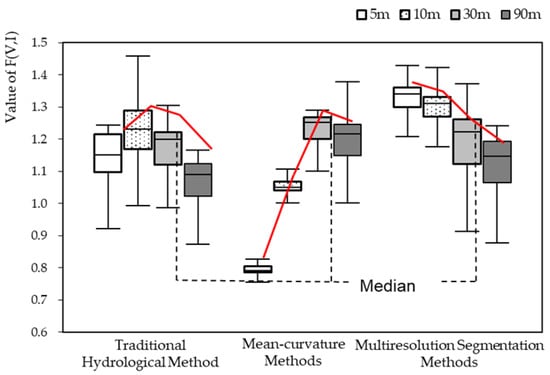 As shown in the calculation of the evaluation function , it is noted that for the three methods mentioned, DEM data with higher resolution do not necessarily correspond to the best segmentation results. In our study, the results obtained from DEM data with the 5 m resolution do not show the best performance. For the two conventional segmentation methods, the evaluation function F value is of the inverted “” type as the resolution decreases. In other words, for the traditional hydrological method, in the range of 90 to 10 m resolution, the value is increased, and the quality of the segmentation unit becomes more advantageous. The segmentation metric reaches a maximum value at 10 m resolution for the optimal segmentation quality. When the data are of a more meticulous 5 m resolution, the F value becomes trifling and slope unit segmentation quality is lowly. For the mean-curvature method, the peak point of the inverted V-curve appears at 30 m spatial resolution. Resolution data above 30 m and below 30 m split out units with lower F values, which have inferior segmentation accuracy.