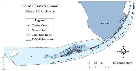 Florida Keys National Marine Sanctuary is part of the National Marine Sanctuary System and is administered by the National Oceanic and Atmospheric Administration (NOAA) Office of National Marine Sanctuaries (ONMS). NOAA defines National Marine Sanctuaries as “protected waters that include habitats such as rocky reefs, kelp forests, deep-sea canyons, and underwater archaeological sites” []. The National Marine Sanctuaries Act established Florida Keys National Marine Sanctuary for the purpose of “managing and protecting the conservation, recreational, ecological, historical, scientific, educational, cultural, archaeological or aesthetic resources and qualities of a national marine sanctuary” []. Florida Keys National Marine Sanctuary was designated on November 16, 1990 and now protects 2,900 square nautical miles of waters. The boundaries of the sanctuary are from south of Miami, Florida to the Dry Tortugas, although it excludes Dry Tortugas National Park (Figure 1). This sanctuary protects a coral barrier reef, extensive seagrass beds, mangrove-fringed islands, more than 6000 species of marine life, as well as historical and archeological heritage such as shipwrecks [].