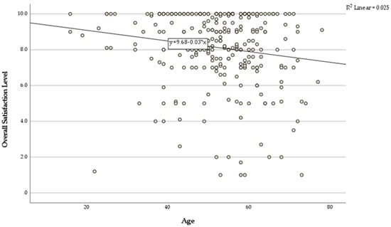 Independent sample t-tests and ANOVAs were run to identify the mean satisfaction level differences between each socio-demographic group. No statistical differences were detected across all groups with respect to overall satisfaction level. Linear regression between overall satisfaction and age showed a significant (p = 0.008; β = −0.157; R2 adj. = 0.021) negative relationship. This means that for every additional year in age, the mean satisfaction level is expected to drop by 0.157 units; in other words, this result showed that the level of overall satisfaction decreases as age increases (Figure 2).