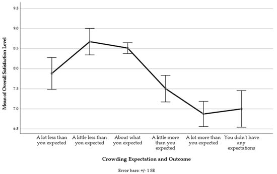 Means plot of ANOVA between satisfaction and crowding expectation/outcome with standard error bars.