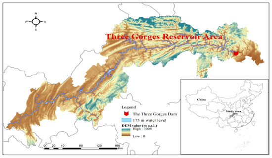 The Three Gorges Reservoir (TGR) is located in the lower section of the main waterway in the upper reaches of the Yangtze River, which is a typical mountainous river. It extends from Jiangjin District in Chongqing to Yichang City in Hubei Province, from west to east (Figure 1). The topography of the Three Gorges Reservoir Area (TGRA) is dominated by mountains and hills. The TGRA has a subtropical monsoon climate with an average annual temperature of 17–19° and annual precipitation of 1000–1800 mm [35]. After the official operation of the TGR, it formed a narrow-valley reservoir with a total length of 660 km and a surface area of 1084 km2. The geographical location of the TGR is between 28°56′ and 31°44′ east (longitude) and between 106°16′ and 111°28′ north (latitude), which includes 25 districts and counties in Hubei and Chongqing municipalities.