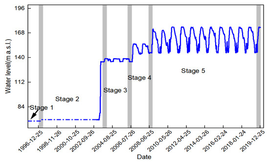 The upper reaches of the Yangtze River were successfully intercepted by the TGD in 1997, raising the reservoir water level to approximately 66 m above sea level. The TGR began storing water in steps from 139 m in June 2003, to 156 m in October 2006 and 175 m in November 2009. It was officially operated after one year of experimental water storage, in 2009 [36]. Thus, based on the construction phase and the changes in the water levels of the TGD (Figure 2), five stages were identified to investigate the morphological changes in the MCBs.