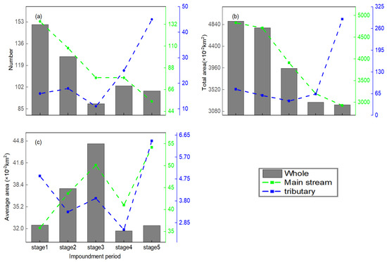 Number and area changes for MCBs during different impoundment periods: (a) number, (b) total area and (c) average area.