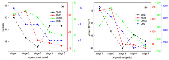 The area and number changes in MCBs for the different classes are presented in Figure 4. In terms of the number, the MCBs in the TGR were dominated by SMBs followed by MMBs, accounting for 55.6% and 20.9% of the total number on average, respectively. In contrast, the MCBs were dominated by LMBs followed by LMMBs in terms of area, accounting for 80.2% and 14.8% of the total area on average, respectively. The number and area variations in the MCBs differed greatly for different sizes, with the most obvious changes in number and area appearing in SMBs (Figure 4a) and LMBs (Figure 4b), respectively. The number of SMBs dramatically decreased from stage 1 to stage 3, then increased sharply to stage 5, which was the main reason for the sharp change in the total number in tributaries from stage 4 to stage 5. The numbers of MMBs, LMMBs and LMBs generally showed a similar decreasing trend as the water level rose. The trend for area changes in MCBs in the TGR was determined by that of LMBs generally, due to the dominant role of LMBs in the total area. MMBs presented a similar trend to LMMBs regarding area, with an increase from stage 1 to stage 2 and a significantly decreasing trend from stage 2 to stage 5.